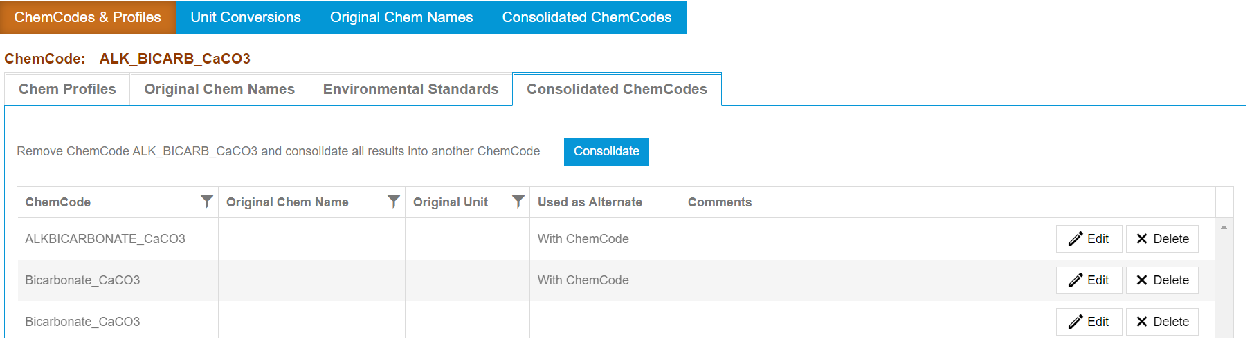 On occasion, different ChemCodes may have been used for the same unique parameter. ESdat provides functionality to consolidate multiple ChemCodes into a single ChemCode. If other ChemCodes have been consolidated into the current ChemCode they are listed here.