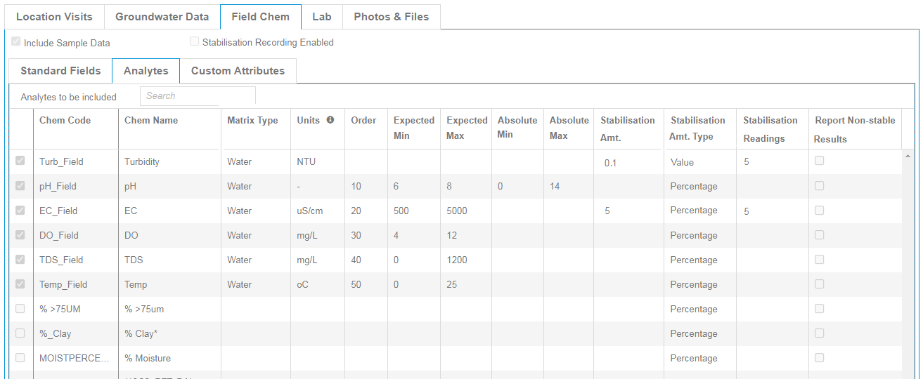 Field Parameters (Analytes) can be specified along with validation checks as shown below.