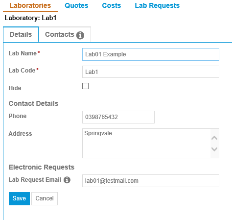 - Lab Request Email: The email address that all electronic requests are sent to for processing by the lab.