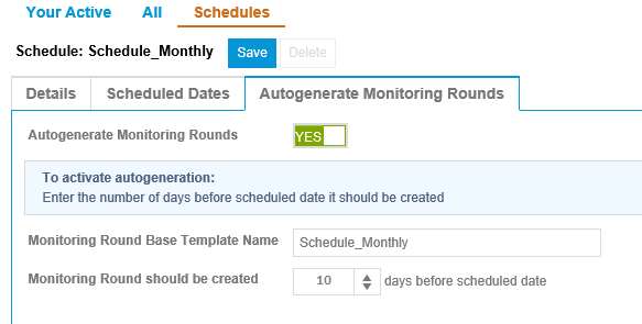 - Start Date and End Date: Date range that the schedule will be valid. This will impact the autogeneration of Monitoring Rounds.